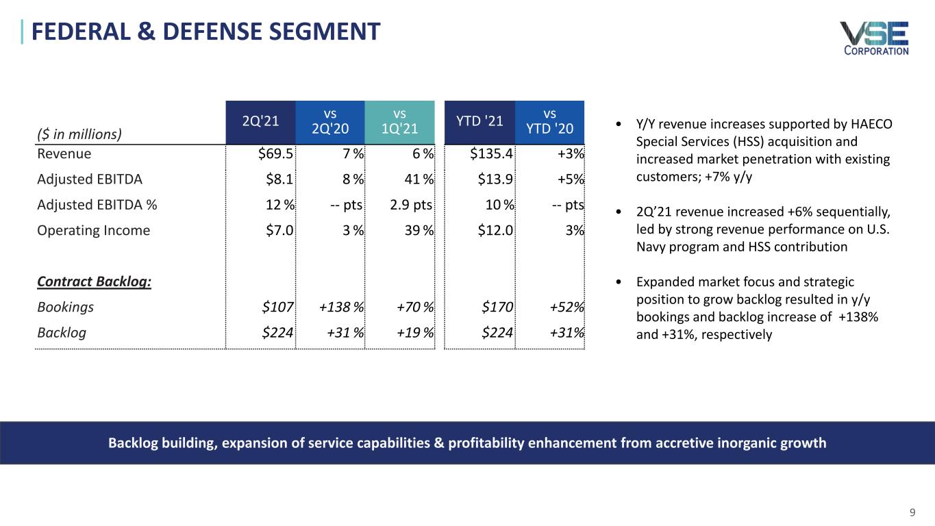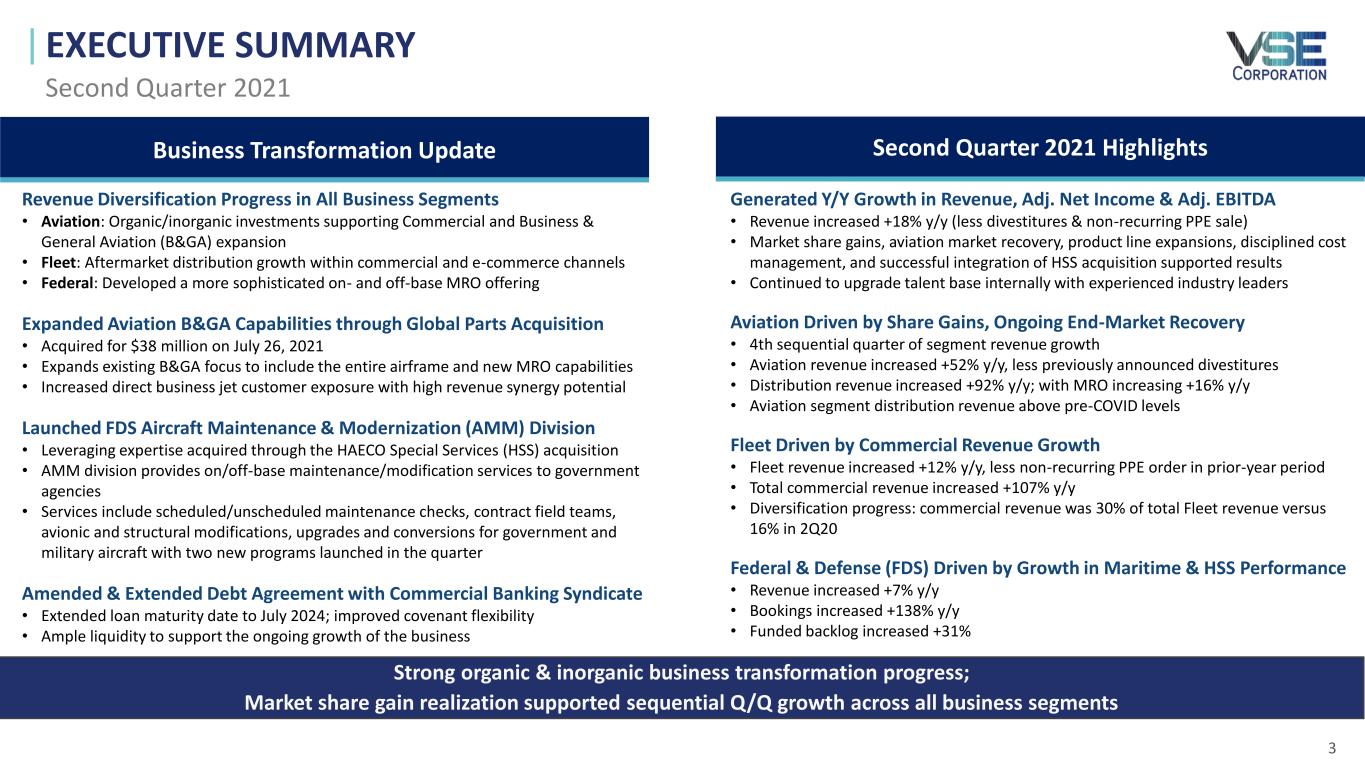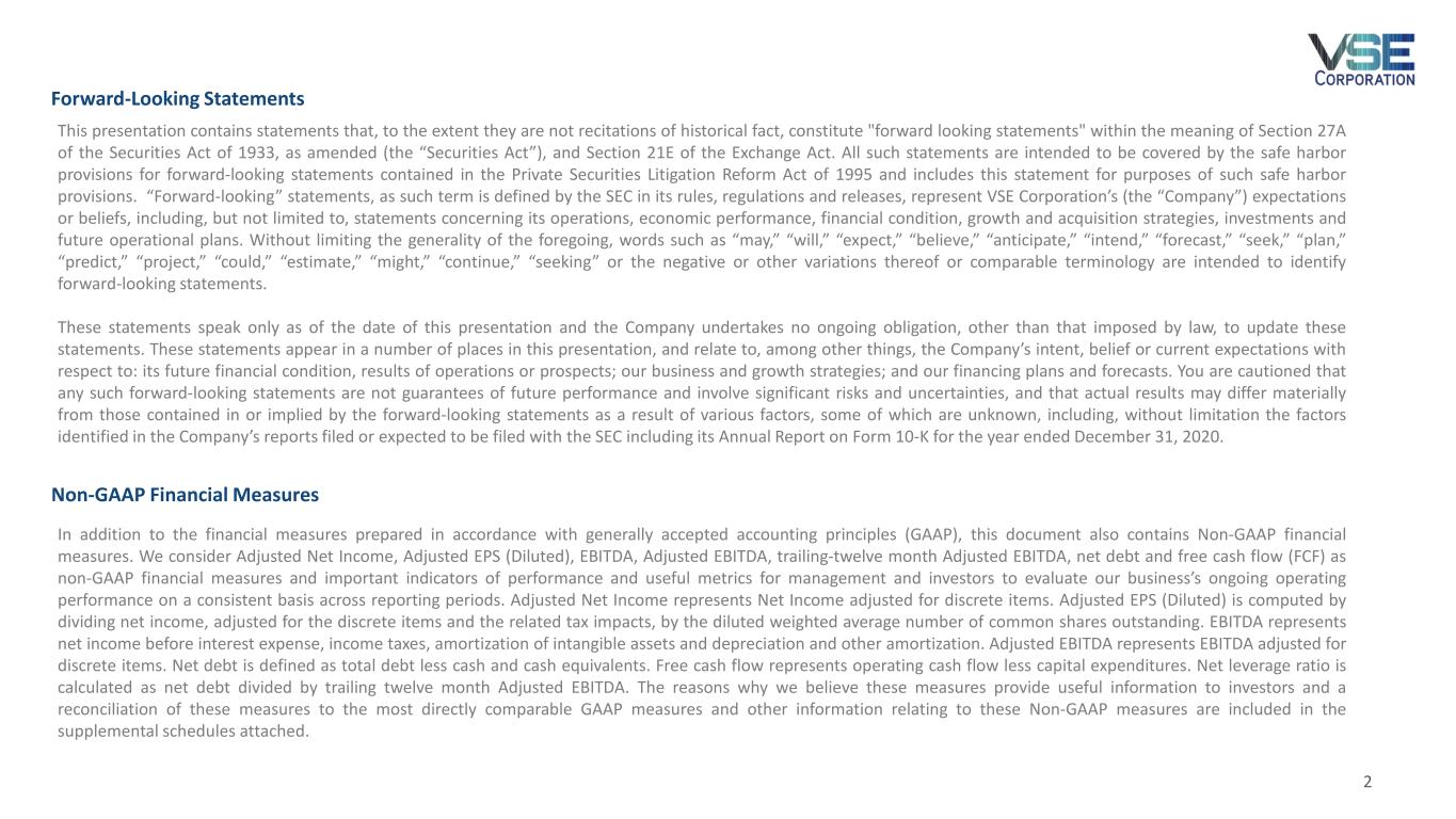 2 This presentation contains statements that, to the extent they are not recitations of historical fact, constitute "forward looking statements" within the meaning of Section 27A of the Securities Act of 1933, as amended (the “Securities Act”), and Section 21E of the Exchange Act. All such statements are intended to be covered by the safe harbor provisions for forward-looking statements contained in the Private Securities Litigation Reform Act of 1995 and includes this statement for purposes of such safe harbor provisions. “Forward-looking” statements, as such term is defined by the SEC in its rules, regulations and releases, represent VSE Corporation’s (the “Company”) expectations or beliefs, including, but not limited to, statements concerning its operations, economic performance, financial condition, growth and acquisition strategies, investments and future operational plans. Without limiting the generality of the foregoing, words such as “may,” “will,” “expect,” “believe,” “anticipate,” “intend,” “forecast,” “seek,” “plan,” “predict,” “project,” “could,” “estimate,” “might,” “continue,” “seeking” or the negative or other variations thereof or comparable terminology are intended to identify forward-looking statements. These statements speak only as of the date of this presentation and the Company undertakes no ongoing obligation, other than that imposed by law, to update these statements. These statements appear in a number of places in this presentation, and relate to, among other things, the Company’s intent, belief or current expectations with respect to: its future financial condition, results of operations or prospects; our business and growth strategies; and our financing plans and forecasts. You are cautioned that any such forward-looking statements are not guarantees of future performance and involve significant risks and uncertainties, and that actual results may differ materially from those contained in or implied by the forward-looking statements as a result of various factors, some of which are unknown, including, without limitation the factors identified in the Company’s reports filed or expected to be filed with the SEC including its Annual Report on Form 10-K for the year ended December 31, 2020. Forward-Looking Statements Non-GAAP Financial Measures In addition to the financial measures prepared in accordance with generally accepted accounting principles (GAAP), this document also contains Non-GAAP financial measures. We consider Adjusted Net Income, Adjusted EPS (Diluted), EBITDA, Adjusted EBITDA, trailing-twelve month Adjusted EBITDA, net debt and free cash flow (FCF) as non-GAAP financial measures and important indicators of performance and useful metrics for management and investors to evaluate our business’s ongoing operating performance on a consistent basis across reporting periods. Adjusted Net Income represents Net Income adjusted for discrete items. Adjusted EPS (Diluted) is computed by dividing net income, adjusted for the discrete items and the related tax impacts, by the diluted weighted average number of common shares outstanding. EBITDA represents net income before interest expense, income taxes, amortization of intangible assets and depreciation and other amortization. Adjusted EBITDA represents EBITDA adjusted for discrete items. Net debt is defined as total debt less cash and cash equivalents. Free cash flow represents operating cash flow less capital expenditures. Net leverage ratio is calculated as net debt divided by trailing twelve month Adjusted EBITDA. The reasons why we believe these measures provide useful information to investors and a reconciliation of these measures to the most directly comparable GAAP measures and other information relating to these Non-GAAP measures are included in the supplemental schedules attached.