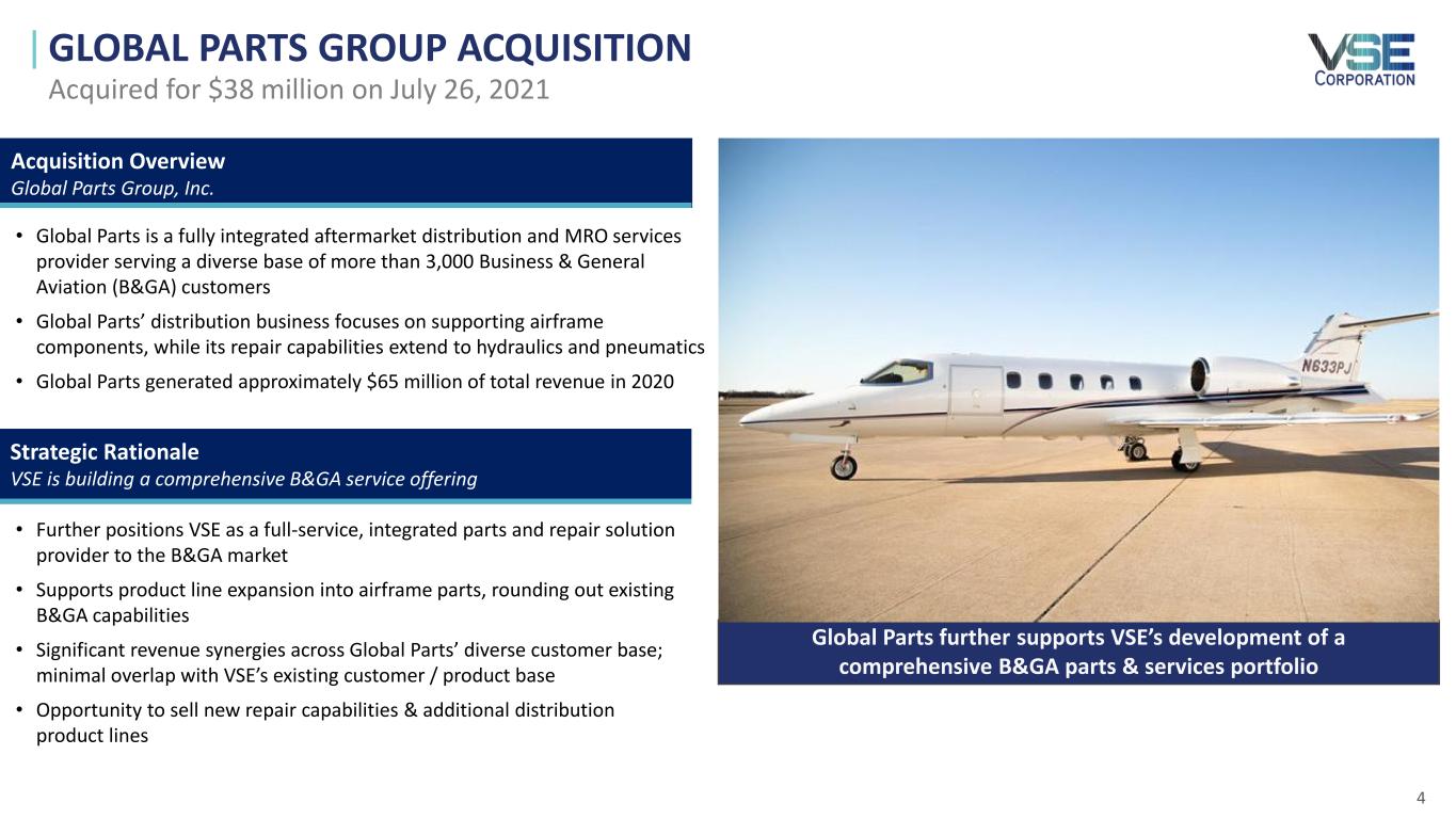 RAISE THE BAR 3 EXECUTIVE SUMMARY Revenue Diversification Progress in All Business Segments • Aviation: Organic/inorganic investments supporting Commercial and Business & General Aviation (B&GA) expansion • Fleet: Aftermarket distribution growth within commercial and e-commerce channels • Federal: Developed a more sophisticated on- and off-base MRO offering Expanded Aviation B&GA Capabilities through Global Parts Acquisition • Acquired for $38 million on July 26, 2021 • Expands existing B&GA focus to include the entire airframe and new MRO capabilities • Increased direct business jet customer exposure with high revenue synergy potential Launched FDS Aircraft Maintenance & Modernization (AMM) Division • Leveraging expertise acquired through the HAECO Special Services (HSS) acquisition • AMM division provides on/off-base maintenance/modification services to government agencies • Services include scheduled/unscheduled maintenance checks, contract field teams, avionic and structural modifications, upgrades and conversions for government and military aircraft with two new programs launched in the quarter Amended & Extended Debt Agreement with Commercial Banking Syndicate • Extended loan maturity date to July 2024; improved covenant flexibility • Ample liquidity to support the ongoing growth of the business Generated Y/Y Growth in Revenue, Adj. Net Income & Adj. EBITDA • Revenue increased +18% y/y (less divestitures & non-recurring PPE sale) • Market share gains, aviation market recovery, product line expansions, disciplined cost management, and successful integration of HSS acquisition supported results • Continued to upgrade talent base internally with experienced industry leaders Aviation Driven by Share Gains, Ongoing End-Market Recovery • 4th sequential quarter of segment revenue growth • Aviation revenue increased +52% y/y, less previously announced divestitures • Distribution revenue increased +92% y/y; with MRO increasing +16% y/y • Aviation segment distribution revenue above pre-COVID levels Fleet Driven by Commercial Revenue Growth • Fleet revenue increased +12% y/y, less non-recurring PPE order in prior-year period • Total commercial revenue increased +107% y/y • Diversification progress: commercial revenue was 30% of total Fleet revenue versus 16% in 2Q20 Federal & Defense (FDS) Driven by Growth in Maritime & HSS Performance • Revenue increased +7% y/y • Bookings increased +138% y/y • Funded backlog increased +31% Business Transformation Update Second Quarter 2021 Highlights Strong organic & inorganic business transformation progress; Market share gain realization supported sequential Q/Q growth across all business segments Second Quarter 2021