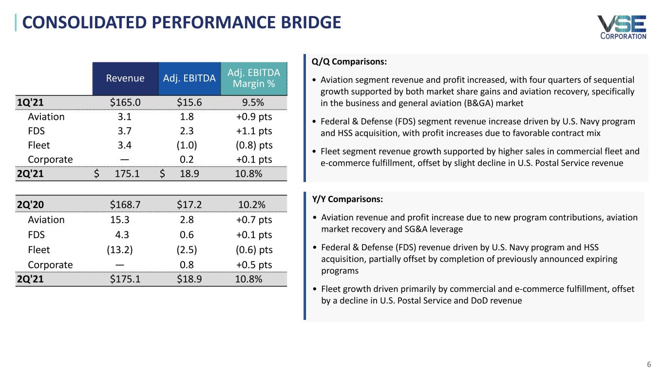 RAISE THE BAR • 2Q’21 revenue of $175M increased 18% y/y(1) • Sequential Q/Q revenue growth across all business segments: Aviation +7%; Federal & Defense +6%; Fleet +6% • 2Q’21 Adjusted EBITDA increase y/y driven by organic and inorganic revenue/margin growth in Aviation and Federal & Defense, offset by lower contributions from Fleet • 2Q’21 GAAP Net Loss due to $24.4M non-cash inventory valuation charge primarily related to Aviation segment 5 VSE FINANCIAL SUMMARY Quarter-to-Date Year-to-Date ($ in millions except EPS) 2Q'21 2Q'20 1Q'21 vs 2Q'20 vs 1Q'21 YTD '21 YTD '20 vs YTD '20 Revenue $175.1 $168.7 $165.0 4 % 6% $340.1 $346.1 (2)% Adjusted EBITDA $18.9 $17.2 $15.6 10 % 21% $34.4 $39.9 (14)% Adjusted EBITDA % 10.8% 10.2% 9.5 % +0.6 pts +1.3 pts 10.1% 11.5% (1.4)pts Operating (Loss) Income $(12.7) $(21.9) $9.6 (42)% (232)% $(3.1) $(12.2) (74)% Net (Loss) Income $(12.4) $(22.6) $5.1 (45)% (343)% $(7.3) $(19.3) (62)% Adjusted Net Income $7.7 $6.6 $5.3 16 % 43% $13.0 $16.4 (21)% Diluted EPS $(0.97) $(2.05) $0.42 (53)% (331)% $(0.59) $(1.75) (66)% Adjusted Diluted EPS $0.60 $0.60 $0.44 -- 36% $1.05 $1.49 (30)% 4th Consecutive quarter of revenue growth; Continued progress on growth plans with new program launches (1) Excluding the 2020 revenue related to Prime Turbines/CT Aerospace divestitures and a non-recurring order for pandemic-related Personal Protective Equipment (PPE), revenue is $175.1 million in 2Q’21, vs. $148.2 million in the same period of 2020