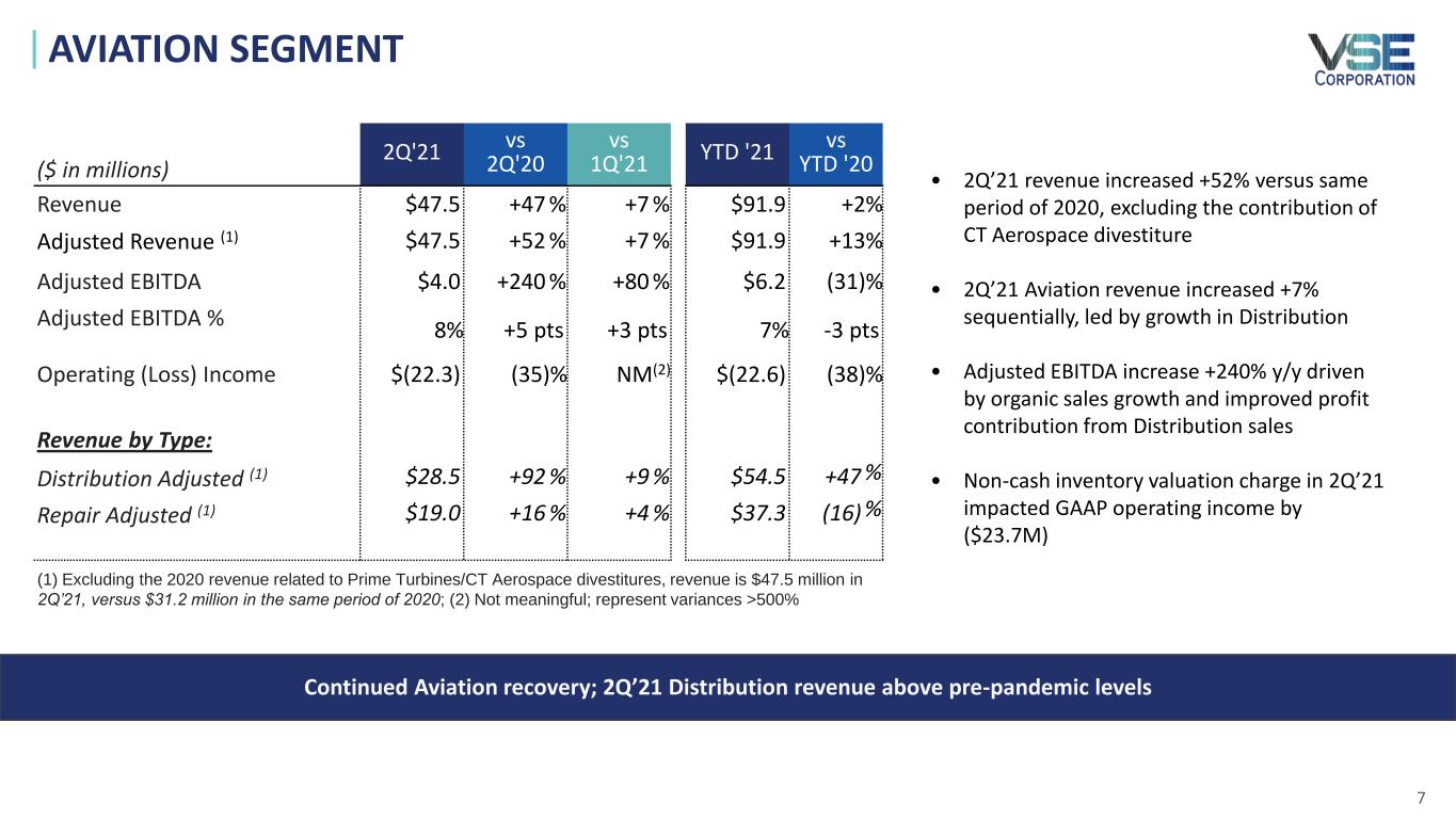 RAISE THE BAR 6 CONSOLIDATED PERFORMANCE BRIDGE Q/Q Comparisons: • Aviation segment revenue and profit increased, with four quarters of sequential growth supported by both market share gains and aviation recovery, specifically in the business and general aviation (B&GA) market • Federal & Defense (FDS) segment revenue increase driven by U.S. Navy program and HSS acquisition, with profit increases due to favorable contract mix • Fleet segment revenue growth supported by higher sales in commercial fleet and e-commerce fulfillment, offset by slight decline in U.S. Postal Service revenue Y/Y Comparisons: • Aviation revenue and profit increase due to new program contributions, aviation market recovery and SG&A leverage • Federal & Defense (FDS) revenue driven by U.S. Navy program and HSS acquisition, partially offset by completion of previously announced expiring programs • Fleet growth driven primarily by commercial and e-commerce fulfillment, offset by a decline in U.S. Postal Service and DoD revenue Revenue Adj. EBITDA Adj. EBITDA Margin % 1Q'21 $165.0 $15.6 9.5% Aviation 3.1 1.8 +0.9 pts FDS 3.7 2.3 +1.1 pts Fleet 3.4 (1.0) (0.8) pts Corporate — 0.2 +0.1 pts 2Q'21 $ 175.1 $ 18.9 10.8% 2Q'20 $168.7 $17.2 10.2% Aviation 15.3 2.8 +0.7 pts FDS 4.3 0.6 +0.1 pts Fleet (13.2) (2.5) (0.6) pts Corporate — 0.8 +0.5 pts 2Q'21 $175.1 $18.9 10.8%