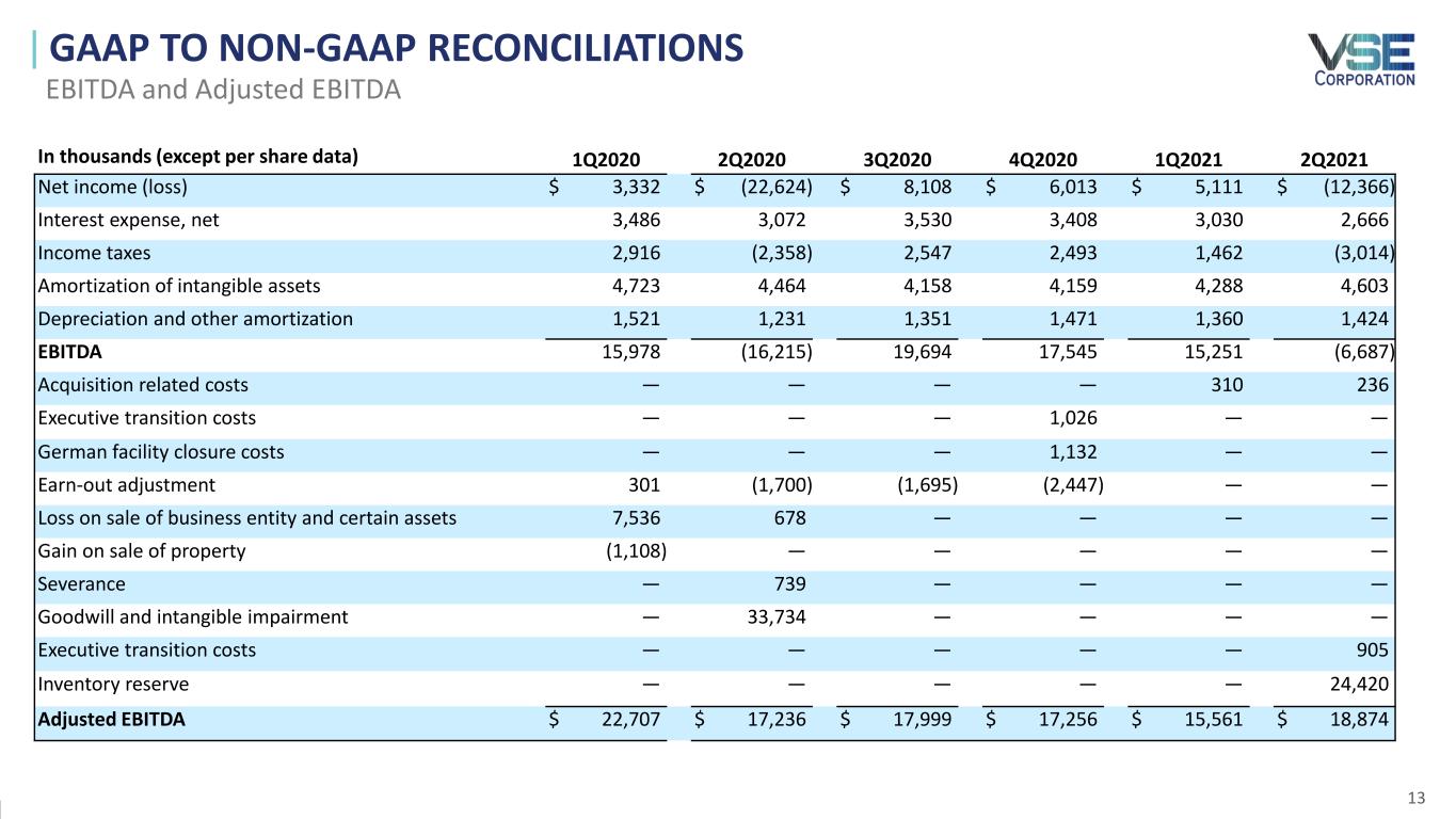 RAISE THE BAR 12 GAAP TO NON-GAAP RECONCILIATIONS Adjusted Net Income and Adjusted EPS (Diluted) (1) Calculation uses an estimated statutory tax rate on non-GAAP tax deductible adjustments. In thousands (except per share data) 1Q2020 2Q2020 3Q2020 4Q2020 1Q2021 2Q2021 Net income (loss) $ 3,332 $ (22,624) $ 8,108 $ 6,013 $ 5,111 $ (12,366) Adjustments to Net income (loss): Acquisition related costs — — — — 310 236 Executive transition costs — — — 1,026 — — German facility closure costs — — — 1,132 — — Earn-out adjustment 301 (1,700) (1,695) (2,447) — — Loss on sale of business entity and certain assets 7,536 678 — — — — Gain on sale of property (1,108) — — — — — Severance — 739 — — — — Goodwill and intangible impairment — 33,734 — — — — Executive transition costs — — — — — 905 Inventory reserve — — — — — 24,420 10,061 10,827 6,413 5,724 5,421 13,195 Tax impact on adjusted items (1) (236) (4,230) 423 70 (78) (5,541) Adjusted Net Income $ 9,825 $ 6,597 $ 6,836 $ 5,794 $ 5,343 $ 7,654 Weighted Average Diluted Shares 11,101 11,041 11,100 11,141 12,172 12,702 Adjusted EPS (Diluted) $ 0.89 $ 0.60 $ 0.62 $ 0.52 $ 0.44 $ 0.60