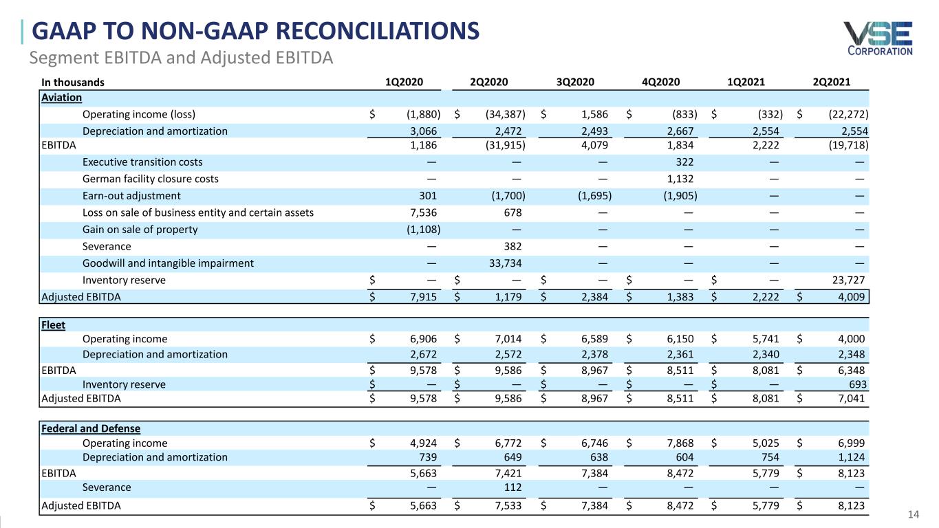 RAISE THE BAR 14 GAAP TO NON-GAAP RECONCILIATIONS Segment EBITDA and Adjusted EBITDA In thousands 1Q2020 2Q2020 3Q2020 4Q2020 1Q2021 2Q2021 Aviation Operating income (loss) $ (1,880) $ (34,387) $ 1,586 $ (833) $ (332) $ (22,272) Depreciation and amortization 3,066 2,472 2,493 2,667 2,554 2,554 EBITDA 1,186 (31,915) 4,079 1,834 2,222 (19,718) Executive transition costs — — — 322 — — German facility closure costs — — — 1,132 — — Earn-out adjustment 301 (1,700) (1,695) (1,905) — — Loss on sale of business entity and certain assets 7,536 678 — — — — Gain on sale of property (1,108) — — — — — Severance — 382 — — — — Goodwill and intangible impairment — 33,734 — — — — Inventory reserve $ — $ — $ — $ — $ — 23,727 Adjusted EBITDA $ 7,915 $ 1,179 $ 2,384 $ 1,383 $ 2,222 $ 4,009 Fleet Operating income $ 6,906 $ 7,014 $ 6,589 $ 6,150 $ 5,741 $ 4,000 Depreciation and amortization 2,672 2,572 2,378 2,361 2,340 2,348 EBITDA $ 9,578 $ 9,586 $ 8,967 $ 8,511 $ 8,081 $ 6,348 Inventory reserve $ — $ — $ — $ — $ — 693 Adjusted EBITDA $ 9,578 $ 9,586 $ 8,967 $ 8,511 $ 8,081 $ 7,041 Federal and Defense Operating income $ 4,924 $ 6,772 $ 6,746 $ 7,868 $ 5,025 $ 6,999 Depreciation and amortization 739 649 638 604 754 1,124 EBITDA 5,663 7,421 7,384 8,472 5,779 $ 8,123 Severance — 112 — — — — Adjusted EBITDA $ 5,663 $ 7,533 $ 7,384 $ 8,472 $ 5,779 $ 8,123