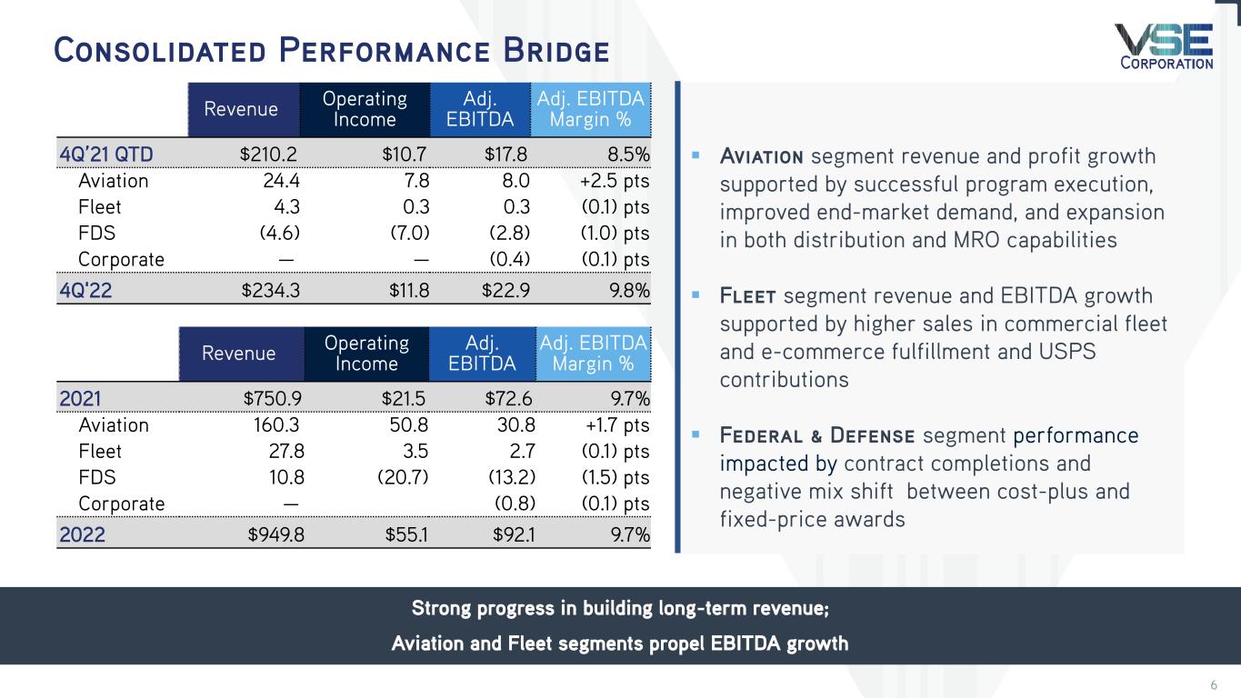 2022 Overview Record-setting year with growth in revenue and profitability Total VSE > Total Revenue: $949.8M, +26% Y/Y > Net Income: $28.1M, +252% Y/Y > Adjusted EBITDA: $92.1M, +27% Y/Y; record year Aviation > Revenue: $408.1M +65% Y/Y; record year > Operating Income: $36.4, NM(1) Y/Y > Adjusted EBITDA: $52.1M, +145% Y/Y Federal & Defense > Revenue: $280.3M, +4% Y/Y > Operating Income: $(0.8)M, (104)% Y/Y > Adjusted EBITDA: $10.8M, (55)% Y/Y Fleet > Revenue: $261.3M, +12% Y/Y; record year > Operating Income: $23.9M, +17 Y/Y > Adjusted EBITDA: $33.2M, +9% Y/Y Balance Sheet > Net leverage ratio reduction to 3.1x from 3.9x > Operating cash flow: $8.1M; Free cash flow: $(3.2)M > Amended and extended credit facility to support growth New commercial growth and operational execution driving record revenue and earnings (1) Not Meaningful as prior period was a net loss 3