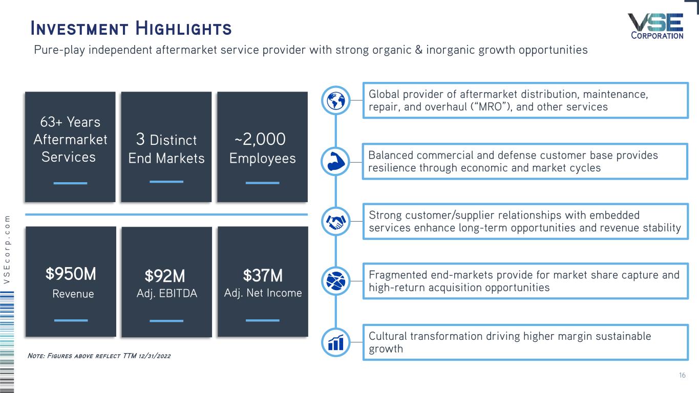 V S E c o r p .c o m Pure-play independent aftermarket service provider with strong organic & inorganic growth opportunities Investment Highlights 3 Distinct End Markets $37M Adj. Net Income ~2,000 Employees $950M Revenue 63+ Years Aftermarket Services $92M Adj. EBITDA Global provider of aftermarket distribution, maintenance, repair, and overhaul (“MRO”), and other services Fragmented end-markets provide for market share capture and high-return acquisition opportunities Strong customer/supplier relationships with embedded services enhance long-term opportunities and revenue stability Cultural transformation driving higher margin sustainable growth Balanced commercial and defense customer base provides resilience through economic and market cycles Note: Figures above reflect TTM 12/31/2022 16