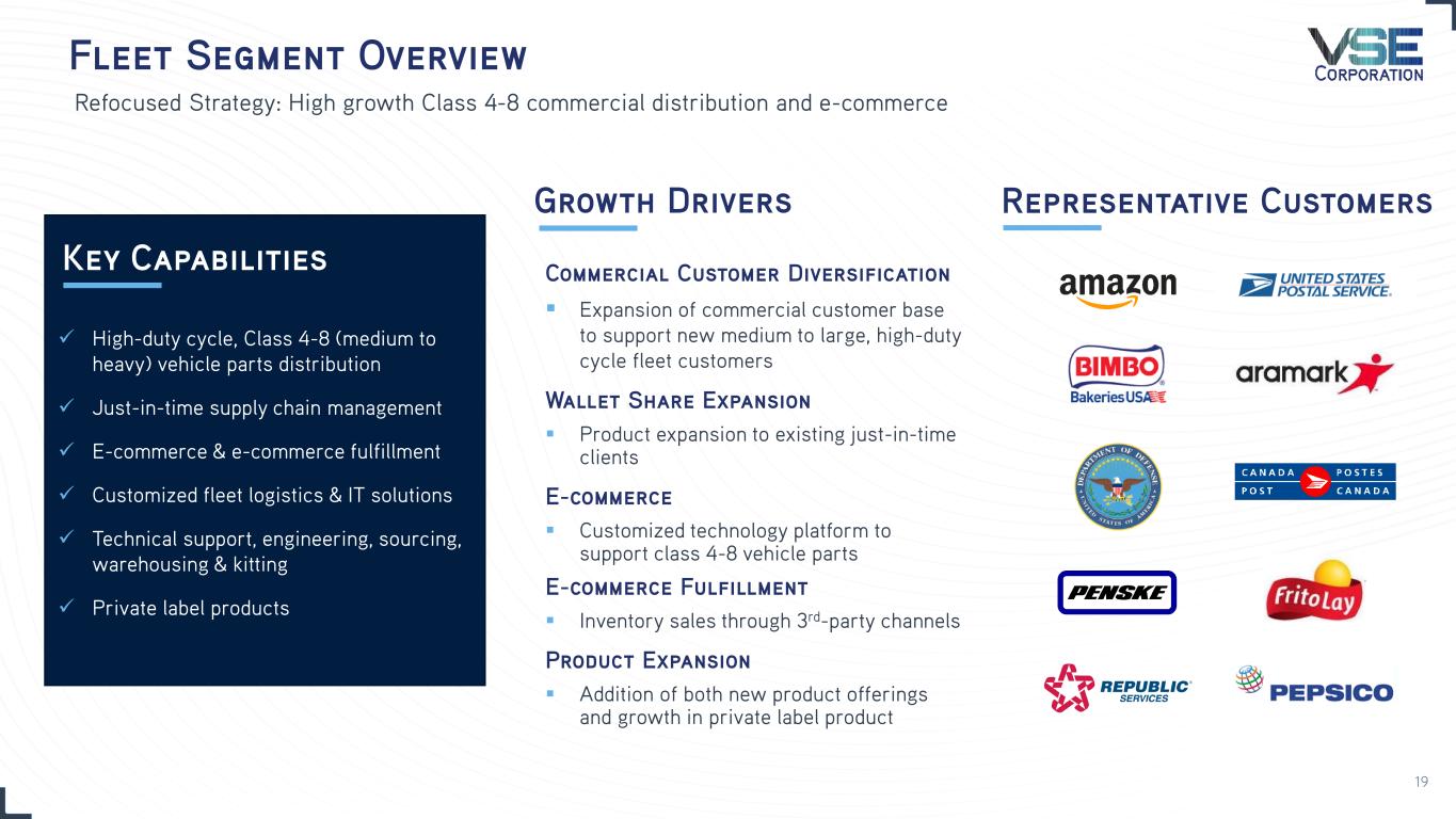 Aviation Segment Overview Refocused Strategy: Higher growth, higher-margin commercial and B&GA distribution and MRO MRO Capability Development ▪ New MRO offerings to support range of components and engine accessory repairs including: fuel and hydraulics, engine components and accessories, interiors, auxiliary power units, and avionics Distribution Product Expansion ▪ New proprietary OEM product additions to support aftermarket landing gear, airframes, engine accessories, avionics, and interiors International Expansion ▪ Expansion in core aerospace markets for MRO and distribution Business and General Aviation (B&GA) ▪ Ability to support underserved B&GA market niche with proprietary part distribution and component and accessory MRO Growth Drivers ✓ Commercial and business & general aviation proprietary product distribution ✓ Supply chain & logistics services ✓ Component & engine MRO services ✓ Rotable exchanges and sales Key Capabilities Representative Customers 18